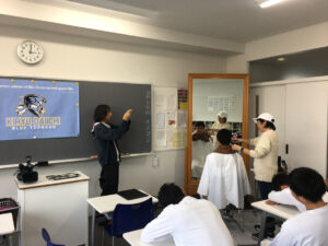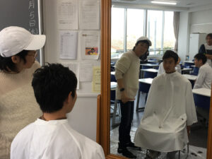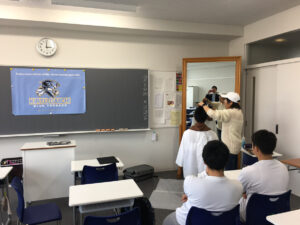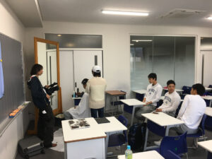 「これからのスポーツはファッションも重要であり、特に高校生はヘアメイクまでこだわってカッコよくやりましょう!」というメッセージももらい、4名の選手には教室で大会当日のヘアメイクを行ってもらいました。