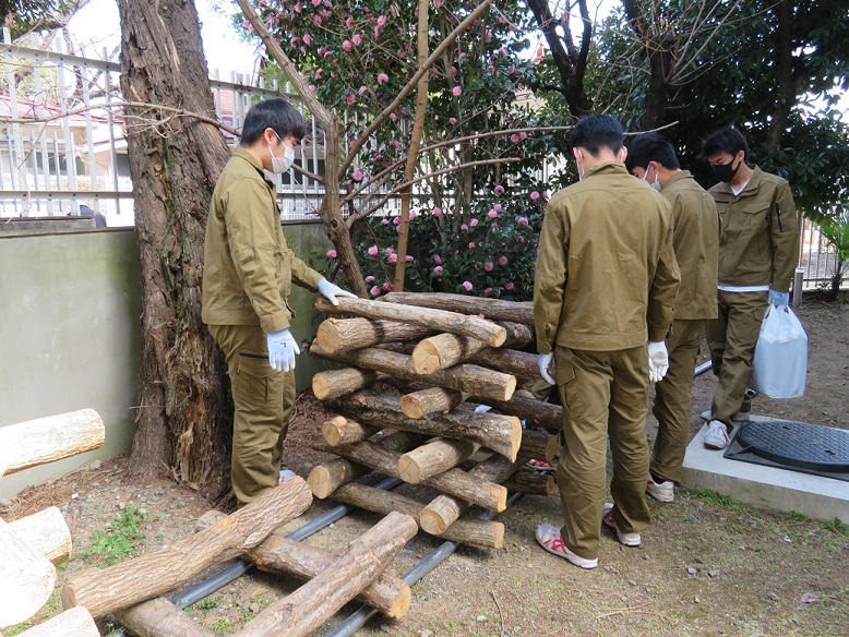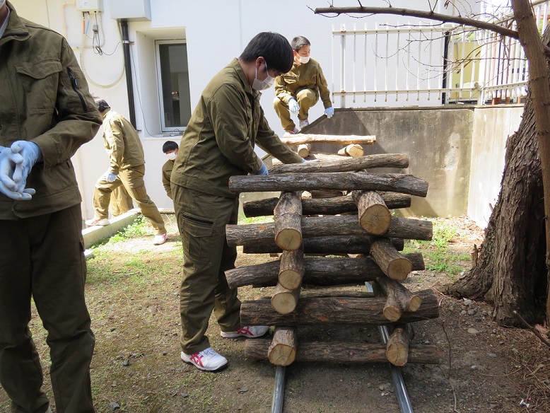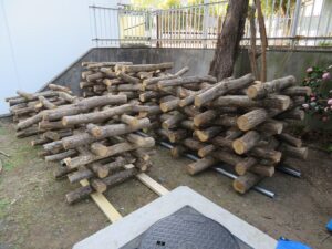 校舎の北側の日陰で、風通しのよさそうな場所へ積んでみました。