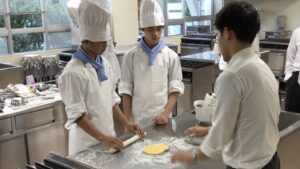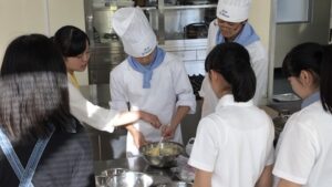 今日(6/2)は製菓関係の専門学校で学んでいる卒業生が来校し、現在の状況について報告がありました。『高校三年間は早く、一日一日悔いない日々を過ごす事が夢実現の第一歩です。そして実習は理論の上に成りっているので座学をしっかり学ぶことがとても大切です。』と後輩生徒へアドバイスしていただきました。放課後では実習実技について指導していただき技術を学んでいました。また調理科の有間先生からもアドバイスいただき色々学ぶ一日でした。