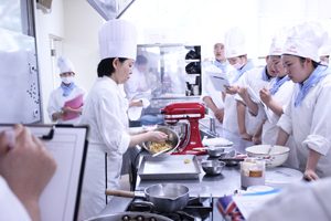 製菓実習の空気はシーンと静かです。なぜならば師範の先生の一言・動作を聞き漏らさず、目で追う授業だからです。