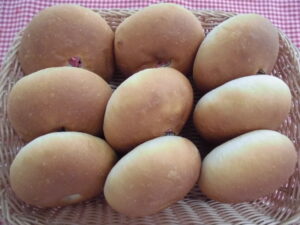 桜あんぱんです。一年生は初めての菓子パンで生地に餡子をつめる作業は、とても難しく力加減が必要です。