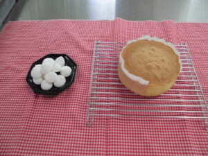 今日は二回目のスポンジケーキの挑戦です。前回の反省を踏まえて取り組みました。またマシュマロも作りました。モチモチとした食感で上手にできました。一学期の実習もあと一回、この暑さに負けず頑張っています。