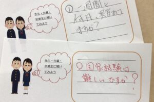 先日行われた、第1回・第2回オープンスクールにおいては多くの中学生・保護者の皆様に参加していただき誠にありがとうございました。そのスケジュールの中での《なんでも聞いてみよう》コーナーが時間の都合上お答えできずにいましたのでこの場で随時お答えしていきたいと思います。先輩たちが質問に答えてくれました。