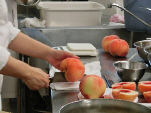 今日はレア・チーズケーキと桃のコンポートを作りました。レア・チーズケーキは来週仕上げをするので楽しみです。桃のコンポートは皮ごと煮ることに驚きました。