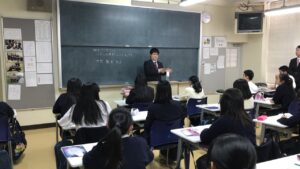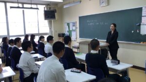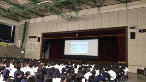 現在 中間テスト期間中ですが、今日は一年生の進路ガイダンスです。二年後の進路に向けての準備として生徒たちは講師の先生方から社会人としての役割・社会貢献について学ばせていただきました。