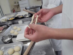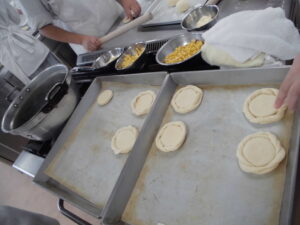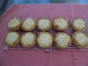 本日のメニューはコーンパンです。初めてのお惣菜パンです。コーンとマヨネーズは焼く直前に和えないとマヨネーズの塩分によってコーンの水分が抜けてしまうからです。具材一つの混ぜ方にも理にかなっていることを学びました。
