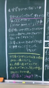 後輩への応援メッセージを黒板に書いてくれました。この三年生も多くの経験・班員とのコミュニケーションで成長しました。