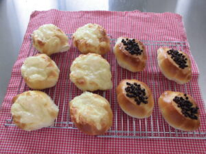 一年生はバターロールです。トッピングにチーズとチョコを加えました。 ポイントは生地の量とトッピングのバランスです。 二年生はスコーンです。ポイントは粉とバターを均一に混ぜることです。