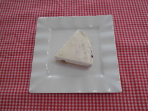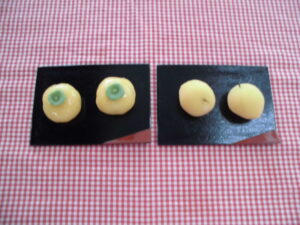 2年生 本日はブルーベリーチーズケーキです。今日のポイントは、チーズケーキ生地とジャムでうまくマーブル模様と作るのがポイントです。 1年生 本日は外郎です。柿とほおずきを作りました。ポイントは、包餡時、生地が冷めると固まってしまうので、熱いうちに包餡するのがポイントです。熱くても、頑張りました。