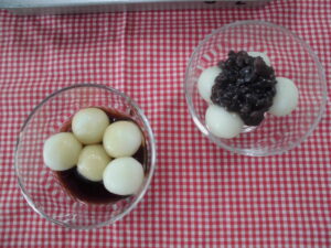 本日は餡作りです。白玉に載せて試食しました。次回は今回作った餡でどら焼き、ちゃぶくさを作ります