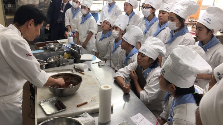初のチョコレート制作で生徒たちは緊張気味で先生の説明を真剣に聞いていました。