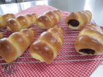 1年本日はコロネです。ねじれないように、均一に巻くことがポイントです。仕上げ、カスタード、チョコクリームをつめました。