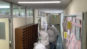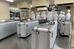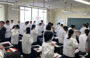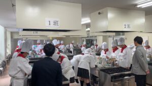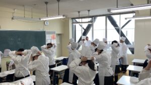ガイダンスでコックコートの着方、衛生意識について実習担当先生から説明されました。