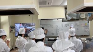 製菓は手先での作業が多く示範の先生方の指使いを見逃さないように天井に鏡があります。今年からは多方向からより分かりやすく技術習得するためにモニターでの実習が始まりました。
