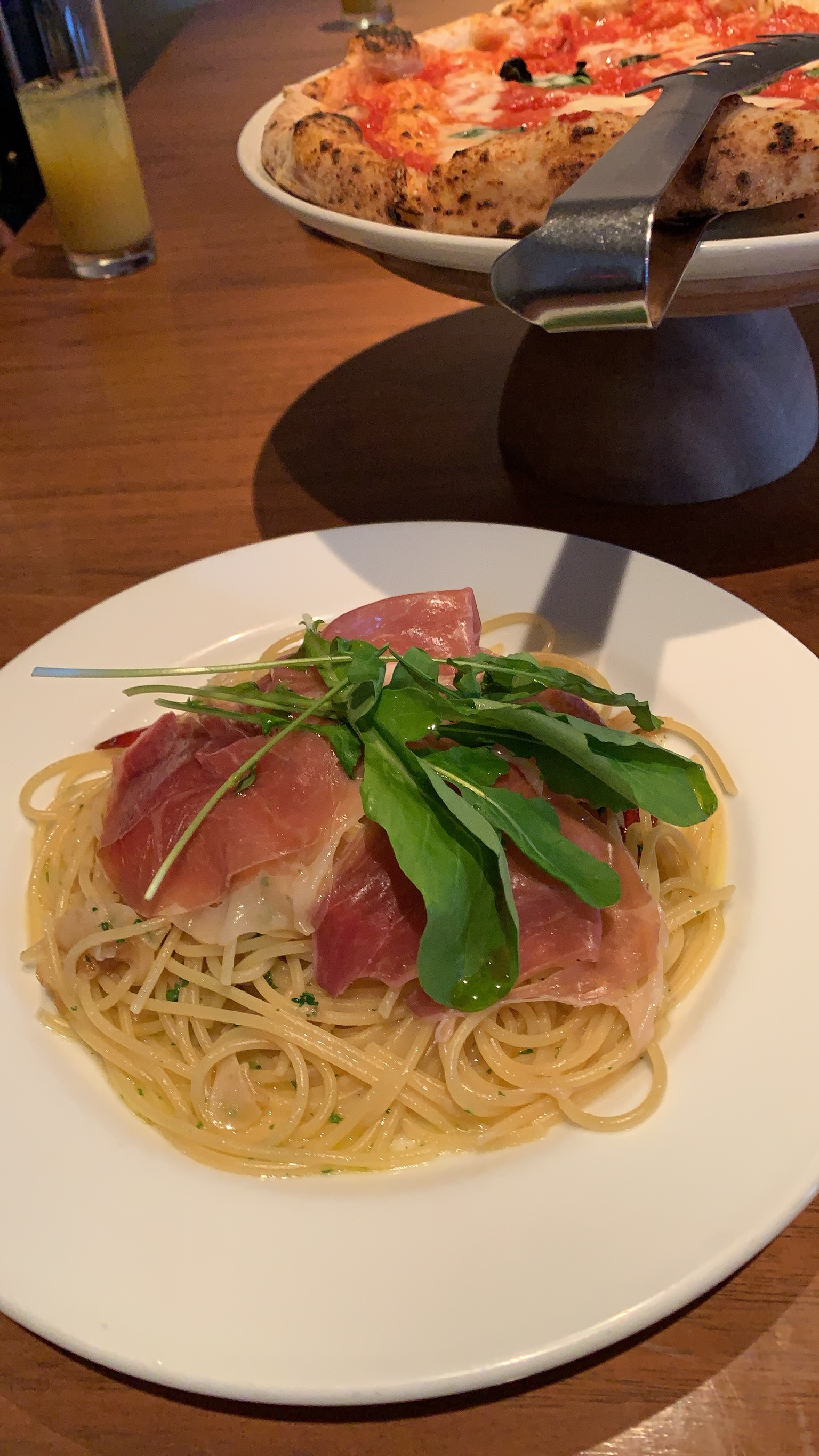 塩加減は夏場、冬場でも味が異なるのでレシピはあるけど塩加減などに関してはシェフの感覚だそうです、オイルや塩などシンプルな味付けながらも油っこくなくとても食べやすいパスタでした。生ハムとの相性も良く美味しかったです。