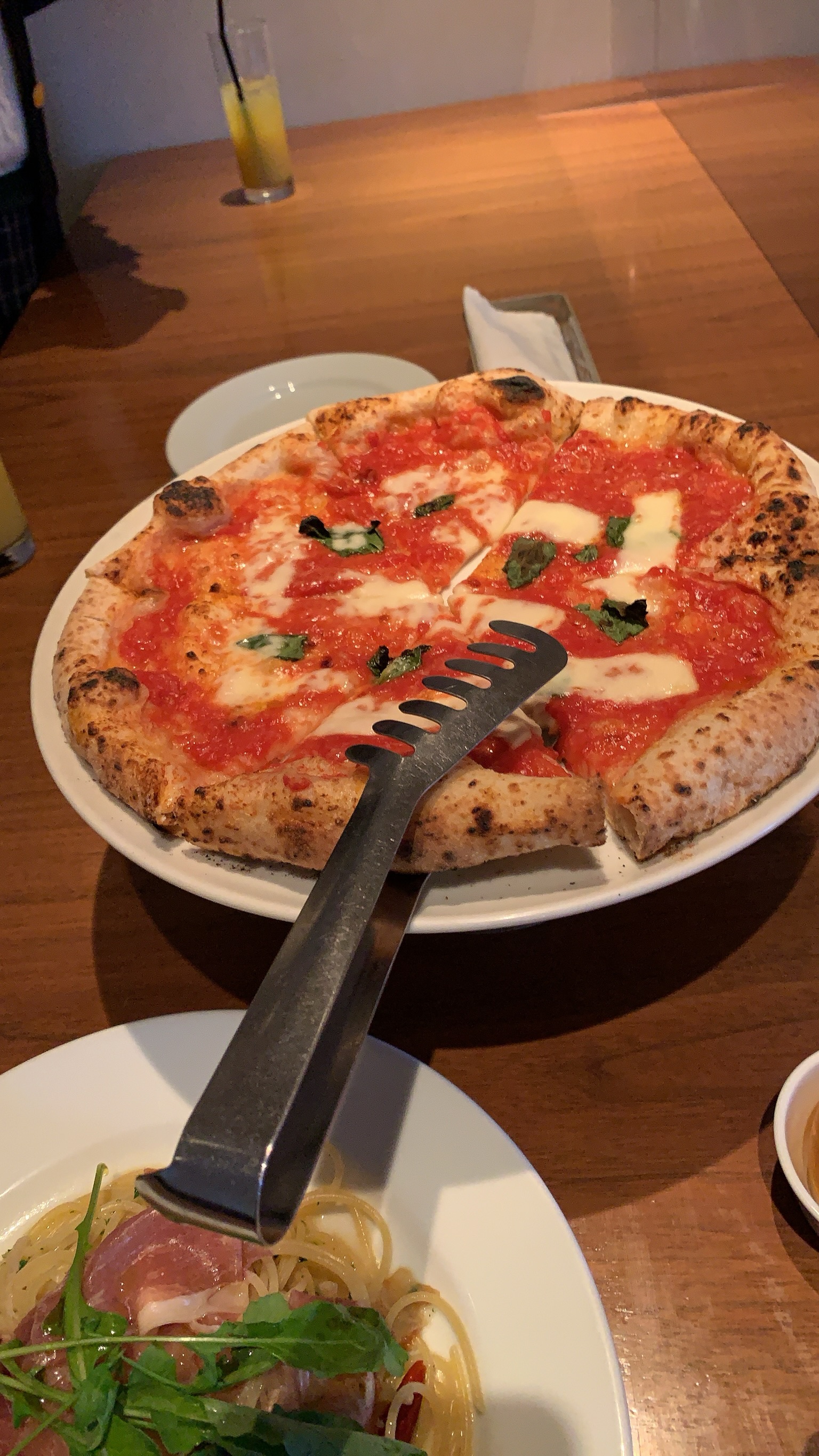 マルゲリータの感想です。ピザはアメリカとイタリアのピザがあり、アメリカのピザは私達が普段食べるピザで、今日食べたピザはイタリアのピザです!イタリアのピサは生地が薄くて耳はもっちりしていてとても美味しかったです、あとトマトの酸味とチーズの乳の甘みとハーブの香りがとても合って私は大好きな味でした。