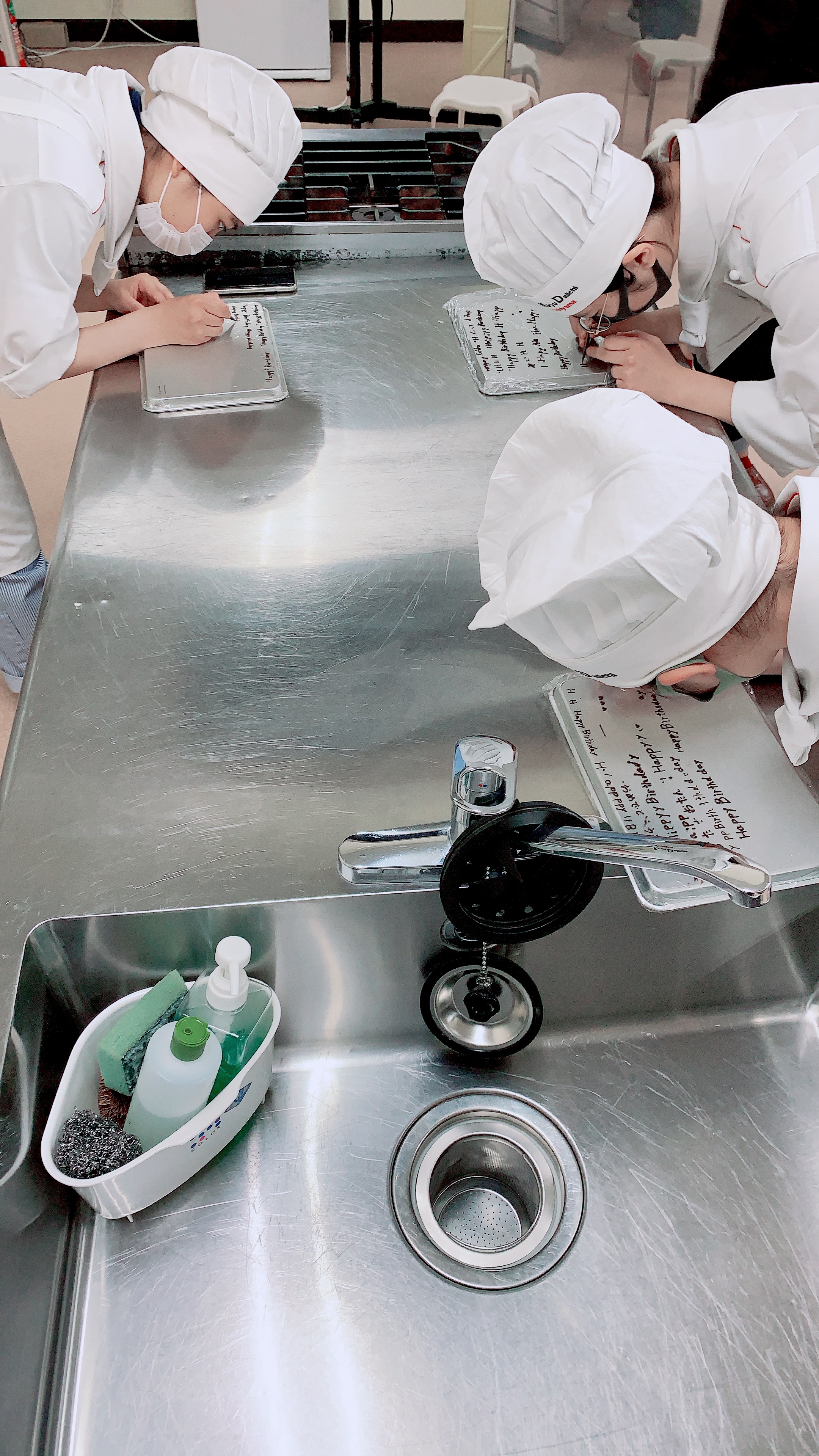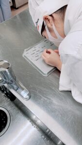 生徒のコメント『今日はありがとうございました。パイピングでは私はあまり得意では無いので、緊張していましたが、自分が今までやっていた書き方とは違くて、見て、真似をしたら最初に書いたものよりもチョコの上に書いたものの方がとても上手く出来ました。まだまだ完璧ではありませんがやり方が分かっただけでもとても勉強になりました。2年ではテストであるので、そこで今日のことを行かそうと思います!ショートケーキを目の前でナッペしてるのを見て、自分と比較するととても早く、スピードと効率を考え、やっていると言っていましたが、これは自分が食べるのではなく、自分じゃないお客さんに食べてもらうので、やはり見た目がとても綺麗だと美味しそうに見えました!桃のケーキでは、桃をまるごとと聞いて、とても驚きました。桃は水分が多いのでグチャグチャにならないのかなと最初は思いましたが、食べてみると丁度いいかたさで、中に入っているカスタードクリームととても合いました!私はもともとシュークリームの中のカスタードクリームが苦手でなかなか自分から食べようとしませんでしたが、今回のものは本当に今まで食べた中で美味しく食べられました!やはり桃が印象が大きかったのですが食べてみると口の中で喧嘩せずにカスタードクリームの美味しさが味わえてよかったです!自分の足でお店の方に行ってみようと思いました改めて今回のイベントに参加してよかったと思いました!また機会があれば参加したいと思います!ありがとうございました』