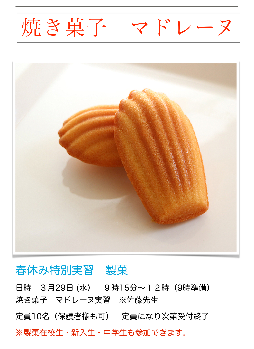 桐生第一高校 製菓衛生師コースでは、新入生・中学生対象に高校の実習室で、マドレーヌ教室を開催します。