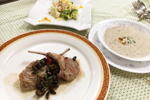 5月25日(水)は仔羊のオリーブ煮、ブロッコリーとエビのタルタル、マッシュルームのポタージュを作りました。