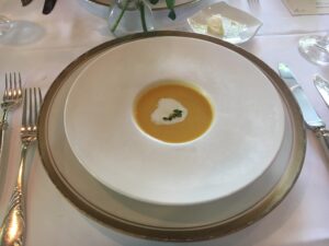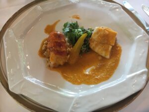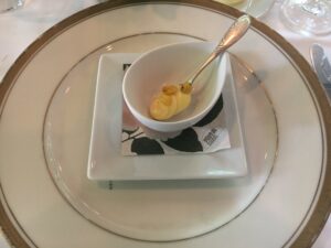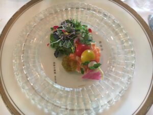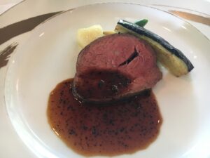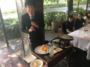 色鮮やかなオードブルに始まり、魚介の旨味を活かしたポワソン、柔らかな牛ヒレ肉のローストビーフなど初めて食べるものばかりで、デザートはクレープシュゼットのデモンストレーションもありました。