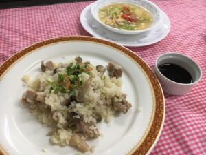 1年生はニンニクがガツンと効いたピラフを作りました。本校では炊飯器を使用せず、鍋でお米を炊いています。パラッとしたニンニク風味のピラフにガーリック醤油をかけて食べます。夏バテ気味のこのシーズンにピッタリのメニューでした。