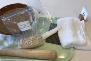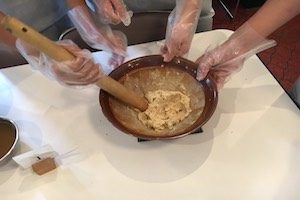 ☆調理科ではグループで大豆からの「お味噌」作り体験です。 味噌は大豆と麹と塩で作ります。グループですり鉢とすり棒でゴリゴリして集中して体験しました。初めはなかなか混ざることができませんでしたが、時間が経つに連れて固まり「できたー」との声が・・・ 初めに味噌の作り方を知ることにより今まで以上に料理に愛情を持ってもらえると思います。その後 半年前に仕込んだ味噌を味噌汁にして飲んでいただきました。