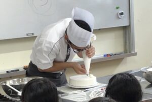☆製菓については「食品学」の模擬授業体験です。寒天とゼラチンの違いについて学びました。そして今年3月卒業の一期生にデモンストレーション(デコレーションケーキ)をしていただき、参加生徒の前で高校三年間の技術を披露すると「すごい」「是非 やってみたい」と、参加生徒から声が上がりました。