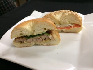 三年生はカニクリームコロッケとベーグルを作りました。ベーグルは2種類のサンドイッチに仕上げました。一つ目はチキンソテーハニーマスタードソース。ハチミツと粒マスタードの相性が抜群です。もう一つはオーソドックスなスモークサーモンとクリームチーズです。表面はパリッと、中はモチモチの最高の出来上がりです。