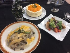 調理科のBLOG デミオムライス、鶏肉のごちそうサラダ、ムース・ア・ロランシェ 3年調理科 ホーム > ブログ > コースのBLOG > 調理科のBLOG > デミオムライス、鶏肉のごちそうサラダ、ムース・ア・ロランシェ 3年調理科 更新日:2017年12月21日 クリスマスが近いため、意識して作りました。 オムライスはデミグラスソースを盛り付けの際、上に掛けることが多いですが、今回はバターライスにデミグラスソースを加え炒めて見ました。卵の上にはキノコのホワイトソースをかけました。