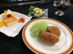 2年生ではメンチカツ、マセドワーヌサラダ、プリンシャンティーを作りました。
