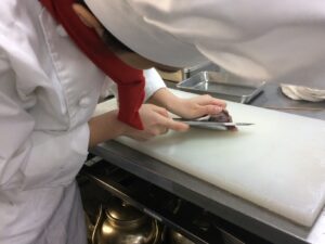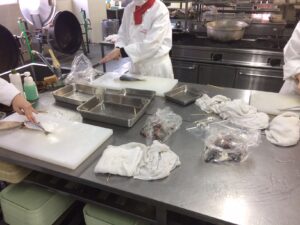 2年調理科は鯵の三枚おろしの実技試験と盛り付けの実技試験です。規定時間内にあじを三枚に綺麗におろし、評価!その後、綺麗に盛り付けて評価!!