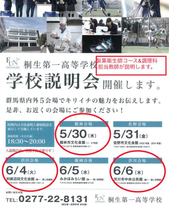 調理科のBLOG 館林市 説明会。何でも相談会。 ホーム > ブログ > コースのBLOG > 調理科のBLOG > 館林市 説明会。何でも相談会。 更新日:2019年05月26日 木曜日に館林市で製菓衛生師コース、調理科の説明会を開催します。受験生、保護者様、中学関係者、塾関係者みなさま 桐生第一高校の製菓衛生師コース、調理科に興味関心がある方ぜひお待ちしております。