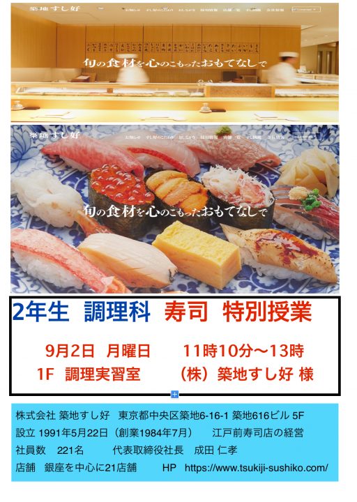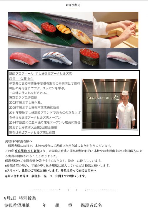 調理科のBLOG いよいよ実現! 寿司特別授業 ホーム > ブログ > コースのBLOG > 調理科のBLOG > いよいよ実現! 寿司特別授業 更新日:2019年08月28日 調理科で なかなか実現でない寿司特別授業を開催します。 (株)築地すし好 様のご厚意により2年生調理科で実施されます。 さまざま料理を多くの専門家から学べる事も生徒満足の 1つと して 教員も一緒に学びたいと思います。