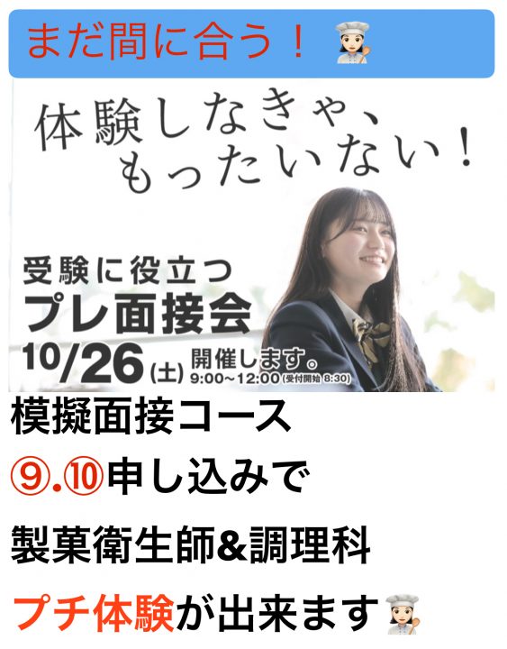 調理科のBLOG まだ間に合う ホーム > ブログ > コースのBLOG > 調理科のBLOG > まだ間に合う 更新日:2019年10月01日 プレ面接会開催について、当日 模擬面接のあとに 製菓衛生師コース&調理科 のプチ体験ができます。 今までのオープンスクールに参加できなかった中学生の皆様へ 是非 参加お待ちしております。 申し込みの時 模擬面接コース⑨又は⑩でお願いします。