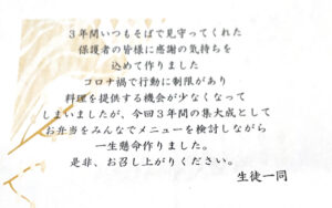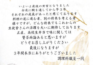 調理科のBLOG 最後の実習 ホーム > ブログ > コースのBLOG > 調理科のBLOG > 最後の実習 更新日:2022年01月19日 https://vt.tiktok.com/ZSe4LDoSt/ 動画↑ 調理科三年生 最後の実習は、3年間の感謝を心こめて、お弁当をつくりました。 毎日のお弁当ありがとうございます。