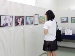 美術授業で制作した作品や、生徒個人で制作した作品など、多くの作品を展示しています。缶バッジ作り体験コーナーもありますので、お気軽にお越しください!!