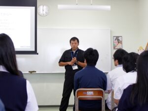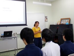 パワーポイントを使って写真なども見せていただき、高校を卒業してからの大学・勤務先での経験や、高校時代の話をしていただきました。