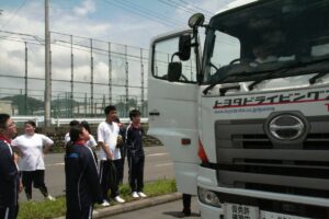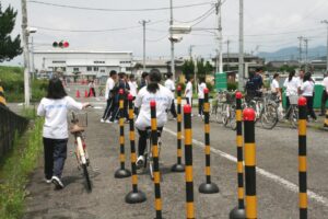 職員の方の説明の後、自転車の安全な乗り方を実際に障害物等も使って実践しました。また、自動車に試乗し、自転車や歩行者が飛び出した際の急ブレーキの状況を体験したり、様々な体験をさせていただきました。