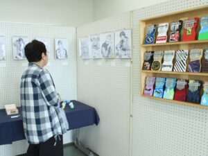 日頃の美術などの授業での作品を展示しています。『缶バッチ作り体験コーナー』も実施しています。