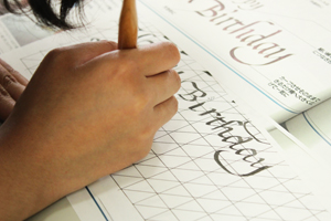 アルファベットを独特のタッチで書く技術で、その中ひとつ、イタリック体でグリーティングカードを作りました。『Happy Birthday』と綺麗に書けるようにするのがポイントです。