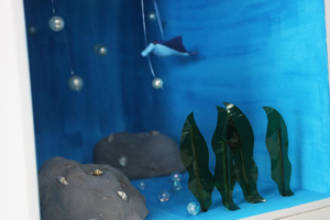 スチレンボードで箱を作り、その中に造形をして光を当て写真として提出する課題です。空間デザインや写真表現を学びます。