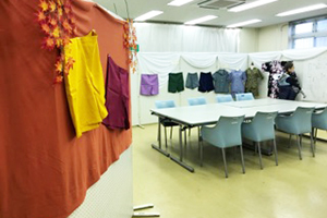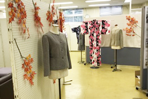 ファッションコースでは手づくりの浴衣や藍染、被服検定で制作したものなどを展示しています。