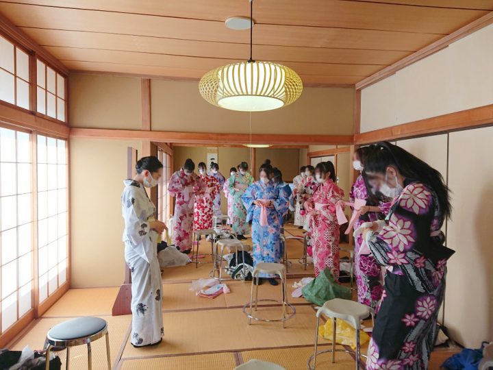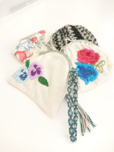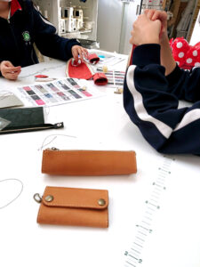 最近の実習では、自分で仕立てた浴衣での着付け教室、フランス刺繍の応用でがま口製作、鞄職人さんのご指導で皮革素材を学び、キーケースとペンケースを制作しました。