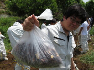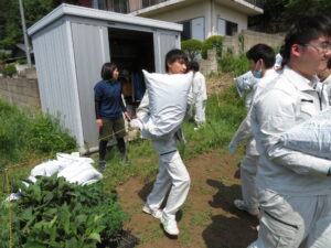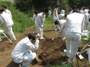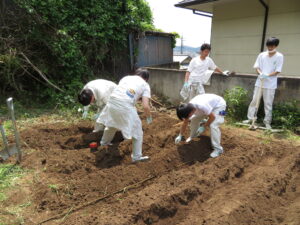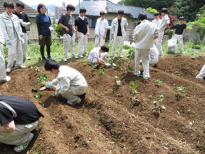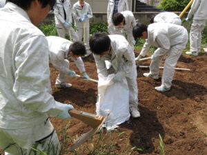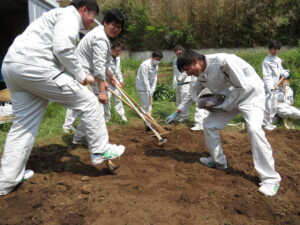 3年ものつくりーコースの農業実習の授業では、畑を作り野菜を育てます。今日は実際に畑に向かう3回目で、耕うんと植付けを行いました。最初に手作業で土を耕し、たい肥を混ぜました。また、たい肥の一部には本校の調理科の調理実習で出た野菜くずなどから作られたたい肥も使っています。エコですね。