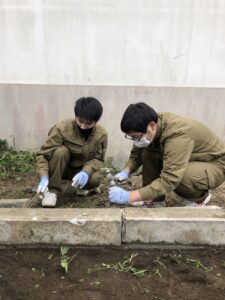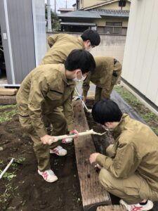 線路に使用した枕木を畑の周囲に設置して、畑の土が雨などで流されないようにしました。