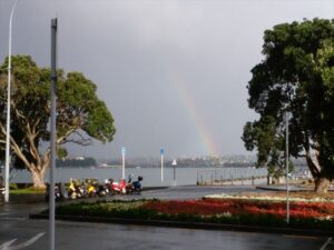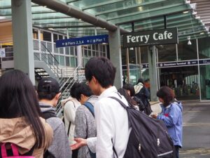 フェリーの出航時刻まで歴史的な建物が残るメインストリートを散策したり、雑貨店やスーパーマーケットで買い物をしたりとのんびりした時間を過ごしました。時折小雨が降るあいにくのお天気でしたが、フェリー乗り場からはきれいな虹が見られました。