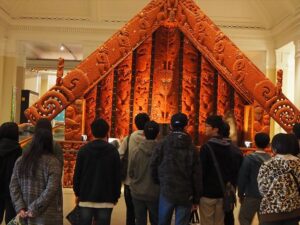 午後はオークランド博物館へ行きました。ここではマオリ族の集会所や100人乗りの木彫りの船、ニュージーランドの自然史、第一次、第二次大戦に関する資料などが展示紹介されていて、ニュージーランドにかかわる文化や自然を深く学ぶことができました。また、マオリショーではマオリの人たちによる歌や伝統舞踊、ハカ(戦闘の前の踊り)を楽しみました。
