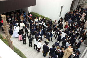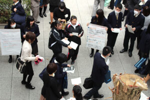 入学式後、生徒玄関前では在校生による部活動への勧誘が行われていました。