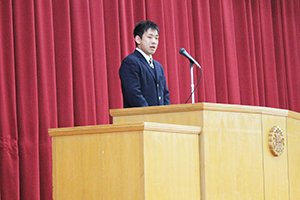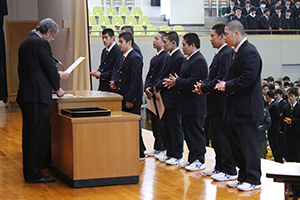 本日は始業式・表彰式の後、花園出場を果たしたラグビー部元主将の新井君より報告会がありました。