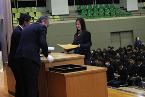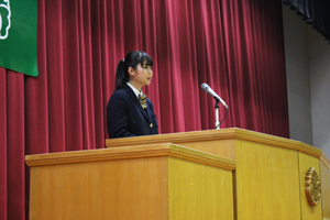 卒業記念品の贈呈と卒業生代表挨拶。